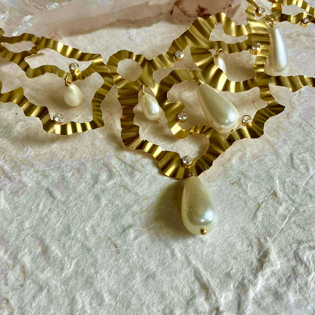 The mix of bold architecture, delicate briolet drop pearls, and subtle sparkle makes it feel like wearable art with personality. Effortlessly chic and eye-catching, it’s perfect for elevating a simple outfit or making a statement at any special occasion.